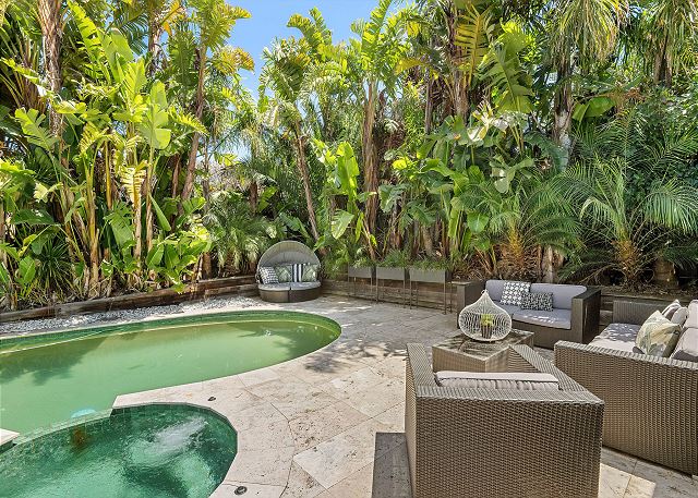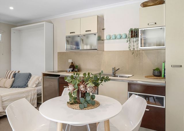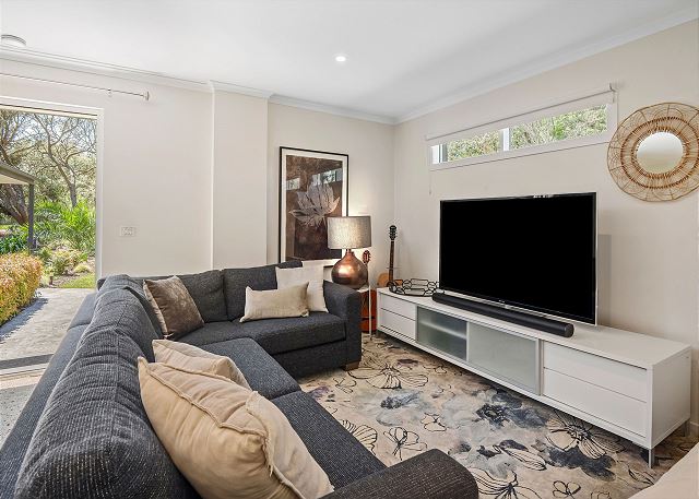 Outdoor Paradise: Step outside to discover paradisiacal gardens with a tropical flair, travertine walkways, and an expansive alfresco terrace overlooking a natural solar-heated pool, gas heated spa, and steam room. Relax in the tranquil surroundings, soak up the sun, or unwind with a refreshing outdoor shower. Indulge in the comforts of home with split-system air-conditioning, outdoor hot/cold shower, poolside full bathroom, and Wi-Fi. Both the main house and studio are equipped with Foxtel and Netflix, ensuring endless entertainment options for guests of all ages.