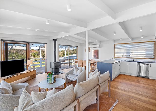 Thoughtfully designed to capture natural light, the home opens into a spacious open-plan living and dining area where warm oak timber flooring and soft neutral tones create a welcoming coastal feel. A cosy Conara wood fireplace adds warmth and ambience during the cooler months, while large windows frame leafy outlooks and allow sunlight to fill the space throughout the day.