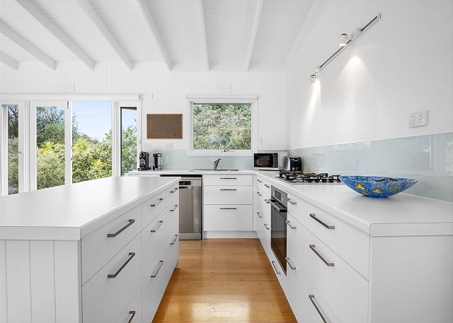 Full Kitchen, Refrigerator, Coffee Maker, Microwave, Toaster, Cookware, bbq utensils, kettle, Oven, dishes, Wine glasses