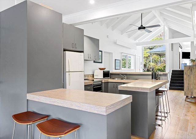 Full Kitchen, Refrigerator, Coffee Maker, Microwave, Toaster, Cookware, Nespresso Pod Coffee Machine, bbq utensils, kettle, Oven, dishes, Wine glasses