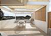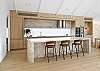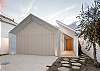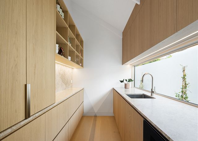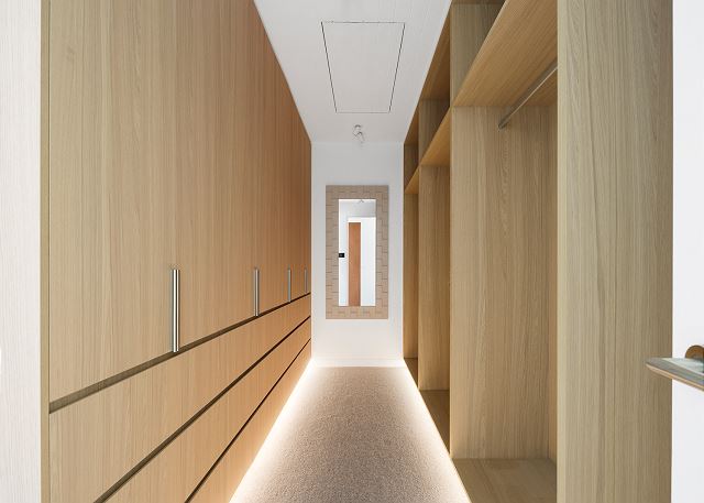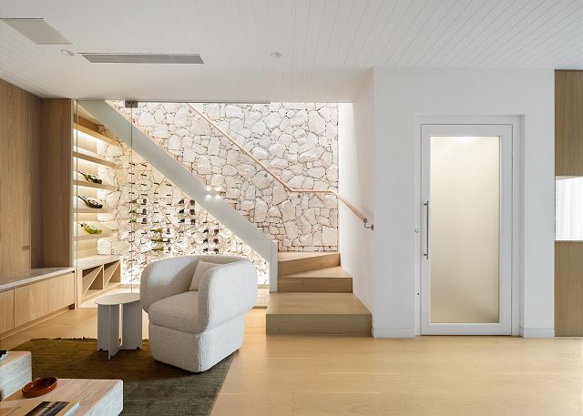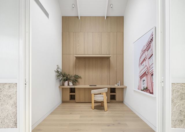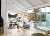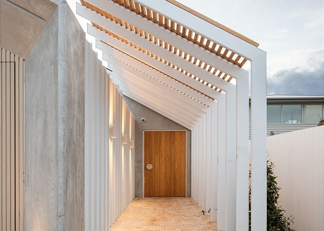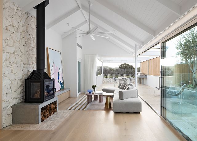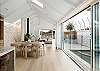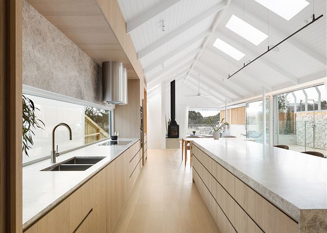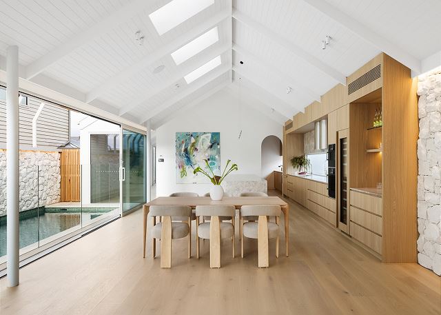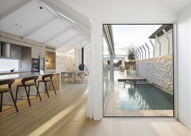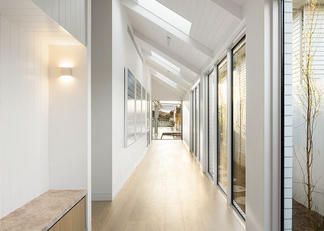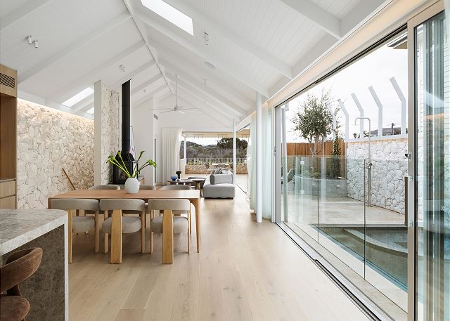 An architectural statement from the outset, the entryway combines raw concrete, vertical timber, and precision-detailed steel beams to dramatic effect. A rhythmic pergola frames the path to a solid oak front door, setting a tone of sculptural sophistication and coastal minimalism. Inside, walls of glazing, floating corner sliding doors, and skylights invite natural light across soaring timber-lined ceilings and French Oak flooring, creating a seamless connection between indoors and out.