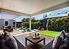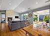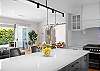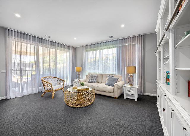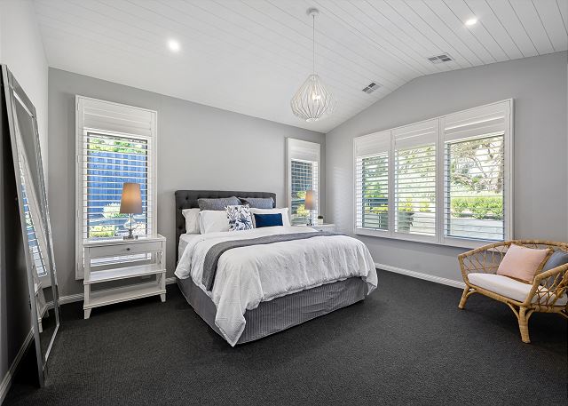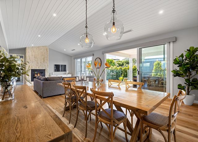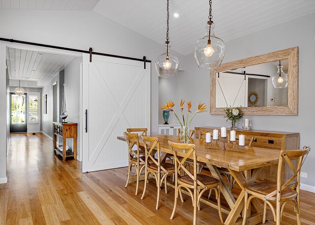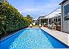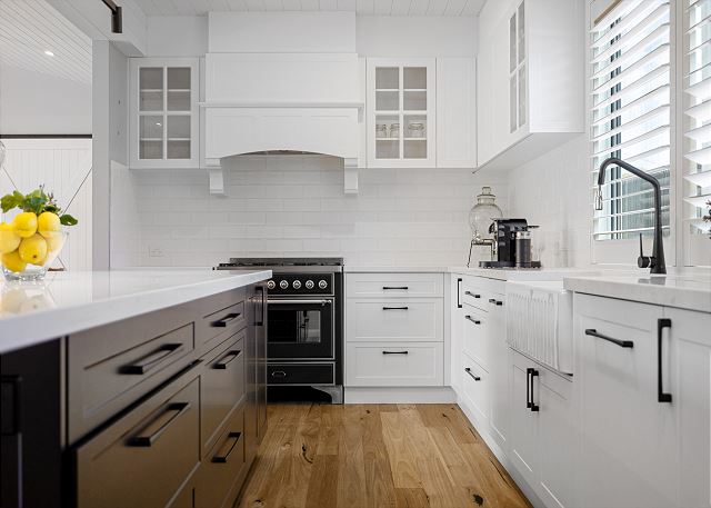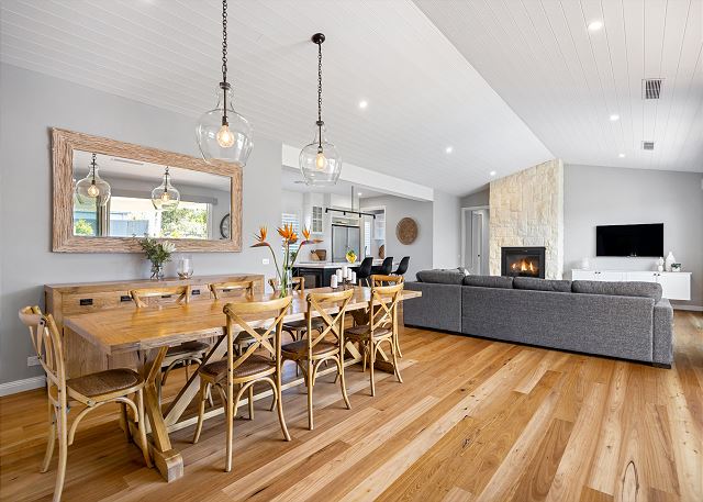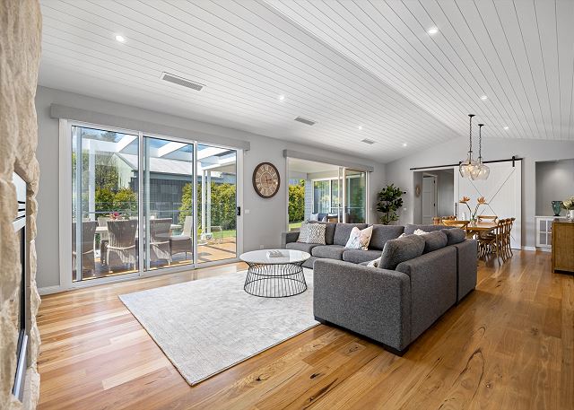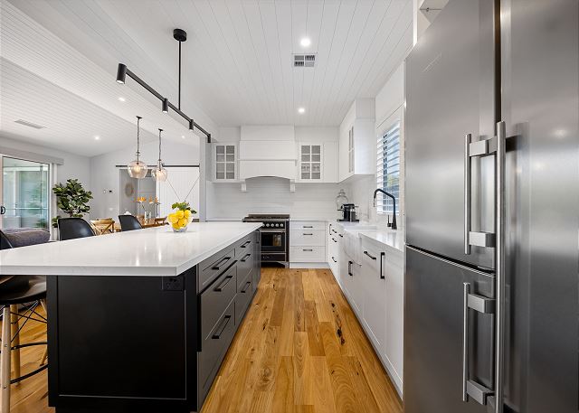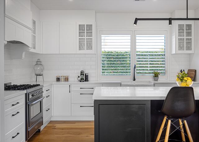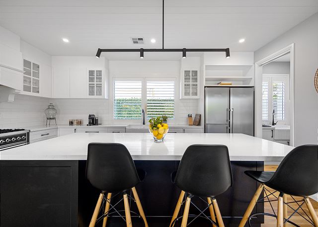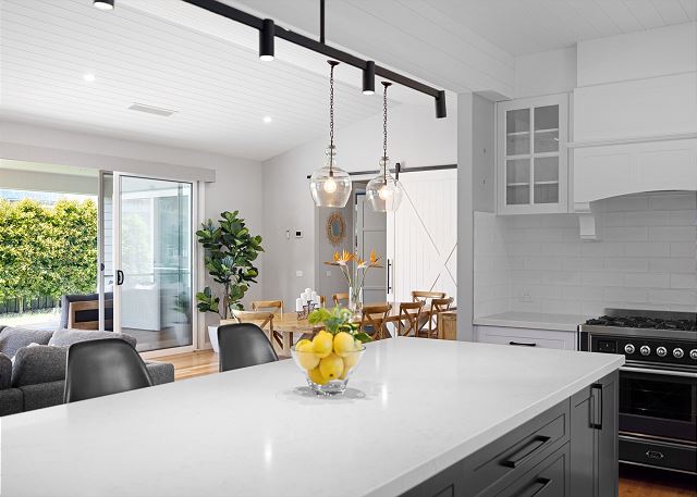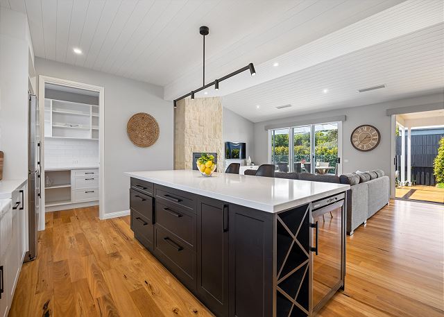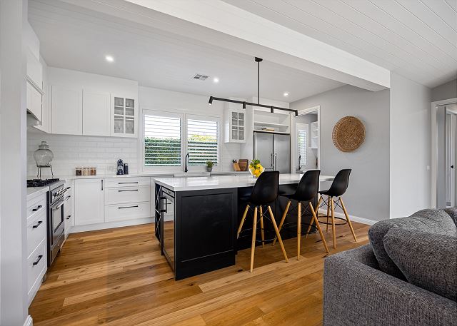 Step inside to discover a beautifully appointed open-plan living area bathed in natural light. The soaring, white-panelled ceiling and warm timber flooring create an inviting sense of space, while plush, comfortable furnishings encourage you to unwind the moment you arrive. Large sliding glass doors frame views of the garden and pool, allowing seamless flow from indoor relaxation to outdoor enjoyment. At the heart of the home is a gourmet kitchen crafted for both casual meals and entertaining. Featuring crisp white cabinetry, a generous island with sleek black accents, premium appliances, and thoughtfully designed storage, it’s a chef’s delight that brings function and sophistication together.
