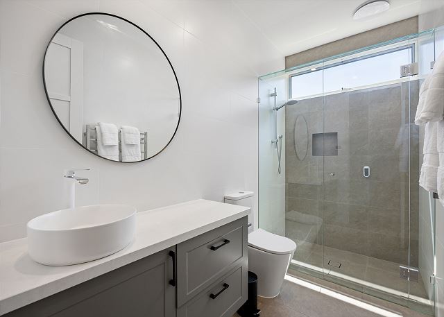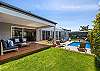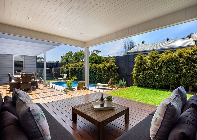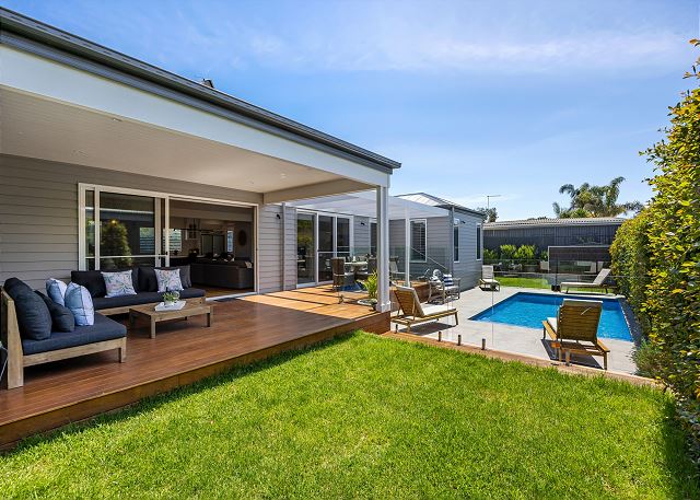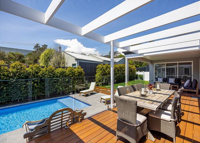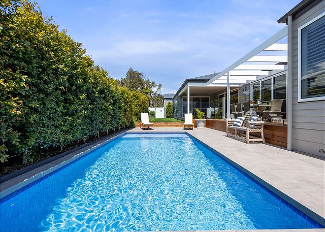 Outside, a spacious covered deck provides an idyllic setting for alfresco dining, morning coffee, or sunset drinks. Overlooking the sparkling, glass-fenced pool, this private oasis is complete with sun loungers, manicured greenery, and multiple lounging zones—perfect for long, lazy afternoons in the coastal breeze. Whether you're enjoying a family getaway, a romantic retreat, or a relaxing break with friends, this tranquil seaside sanctuary offers everything you need: luxurious comfort, effortless indoor–outdoor living, and the uplifting atmosphere of a contemporary coastal home. Relax, rejuvenate, and experience the very best of beachside living.